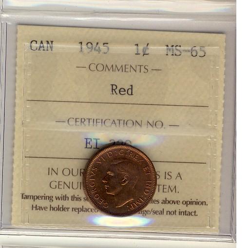 1945 1¢ ICCS MS65RD. Typical wine red finish.