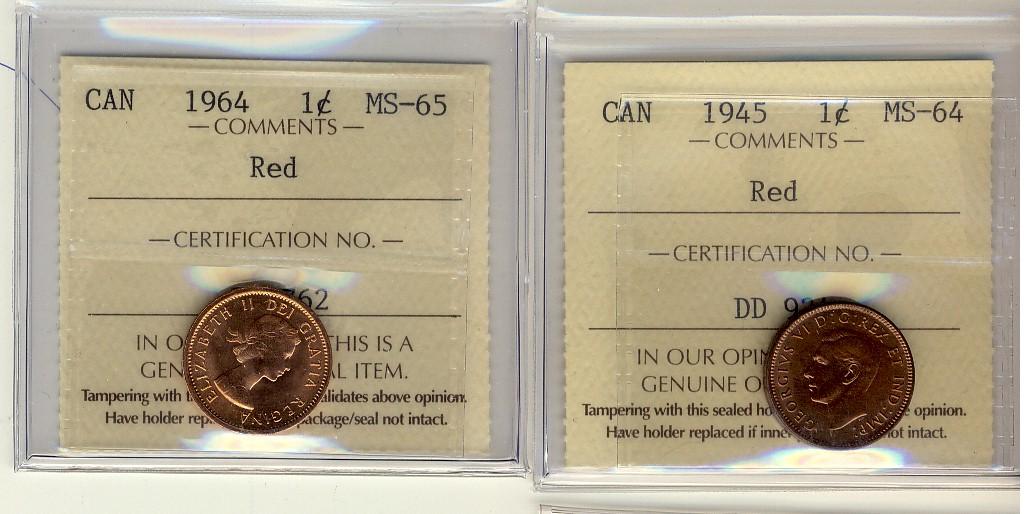 1945 1¢ MS64RD & 1964 1¢ MS65RD. Lot of two coins ICCS graded.