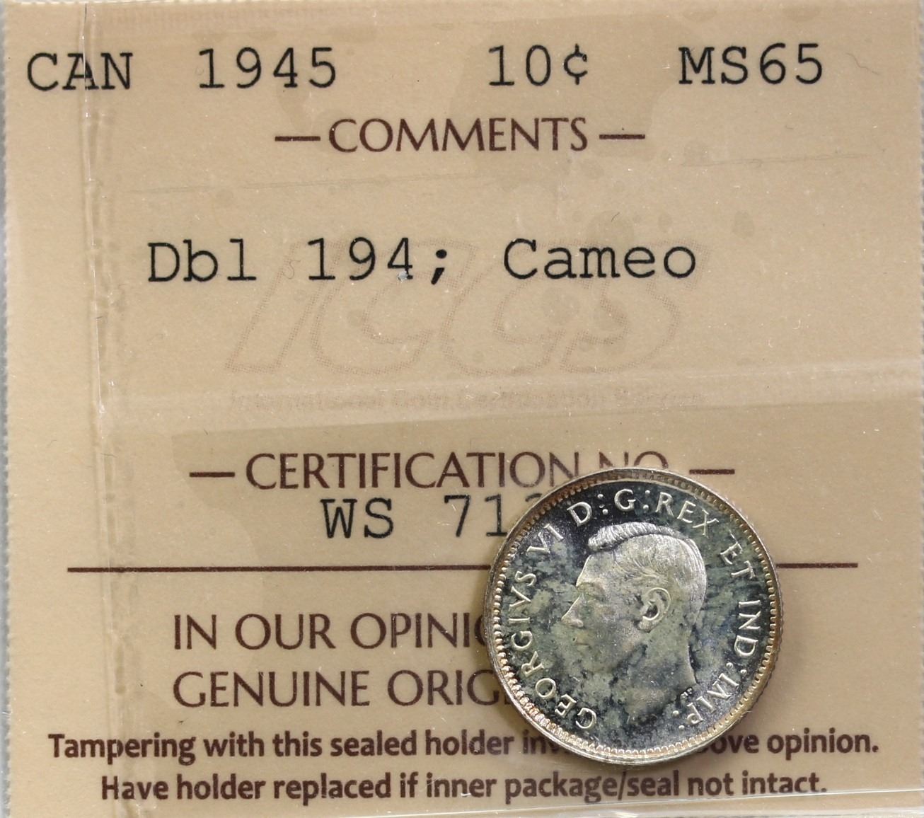 1945 10¢ "Dbl 194, Cameo" ICCS Gem Mint State-65. A lovely example with nice eye appeal. With a nearly fully doubled date, cameo and light golden tones. This piece is unlisted in trends and comes in a 2 letter ICCS holder. A 1938 "Dbl 193" in Choice Mint State-64 brought it $896 at the 2025 Summer Sale.