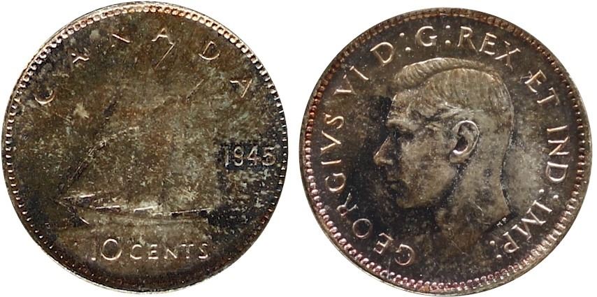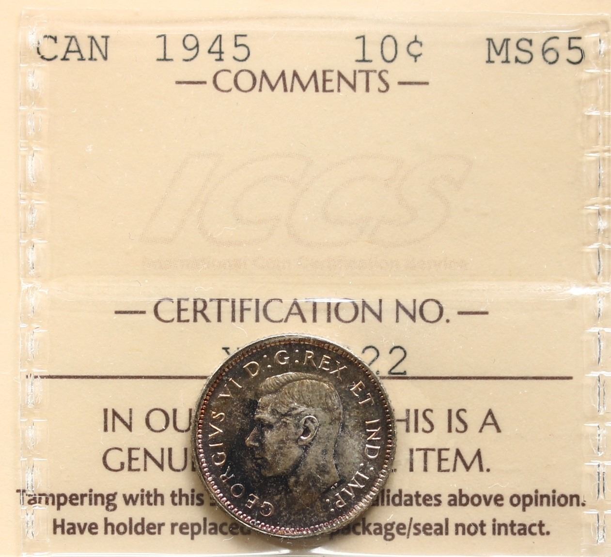 1945 10¢ ICCS Gem Mint State-65 Lustrous example with gold and russet tones.