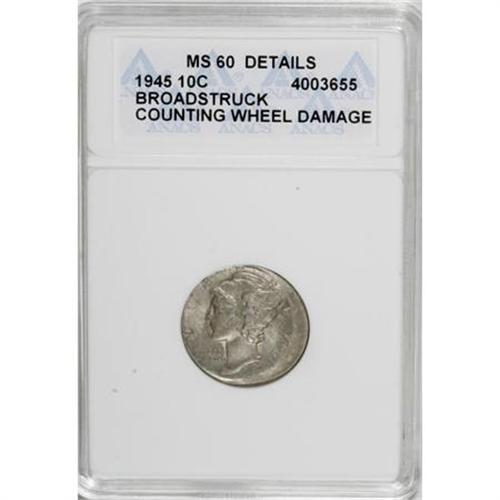 <B>1945 10C Mercury Dime--Broadstruck, Counting Wheel Damage--ANACS. MS60 Details.</B></I> <BR><BR><B>Coin Engraver:</B> Adolph A. Weinman<BR><BR><b>Shipping:</b> Coins & Currency (<a target="_blank" href="http://www.heritageauctions.com/common/shipping.php">view shipping information</a>)