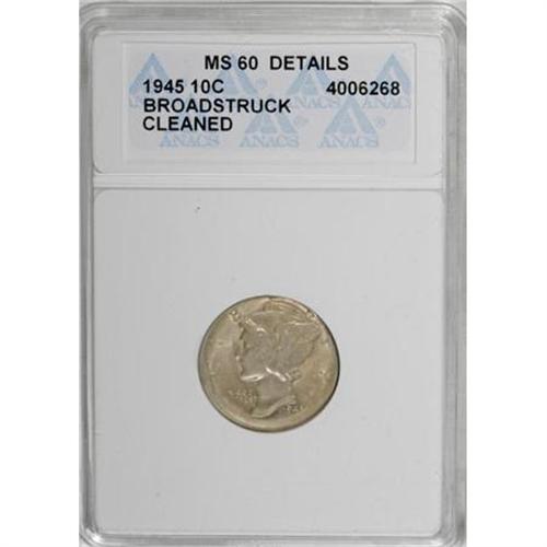 <B>1945 10C --Broadstruck, Cleaned--ANACS. MS60 Details.</B></I> Slightly uncentered toward 1 o'clock. The central bands are fully split, a rare event for a non-broadstruck 1945 dime. The lustrous surfaces display lilac and tan toning. The portrait and the upper left reverse field show patches of faint parallel lines that ANACS has interpreted as cleaning. It is the cataloger's belief that these are lines were caused by a pass through a mechanical device such as a coin counter.<BR><BR><B>Coin Engraver:</B> Adolph A. Weinman<BR><BR><b>Shipping:</b> Coins & Currency (<a target="_blank" href="http://www.heritageauctions.com/common/shipping.php">view shipping information</a>)