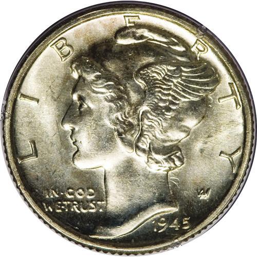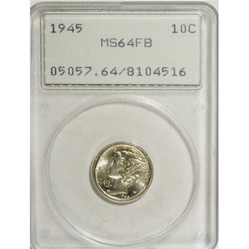 <B>1945 10C MS64 Full Bands PCGS.</B></I> The 1945 Full Bands dime is the most famous "strike rarity" in American numismatics. Uncirculated 1945 dimes are sufficiently common that they are sometimes available by the roll. But invariably, these pieces are softly defined on the all-important central bands. The present piece is a fortunate exception to the rule. Not only are the bands fully split, but the peripheral legends are crisp at the tops of the letters. In addition, the lightly toned and lustrous surfaces are clean for the MS64 level. Encapsulated in a first generation PCGS holder.<BR><BR><b>Shipping:</b> Coins & Currency (<a target="_blank" href="http://www.heritageauctions.com/common/shipping.php">view shipping information</a>)