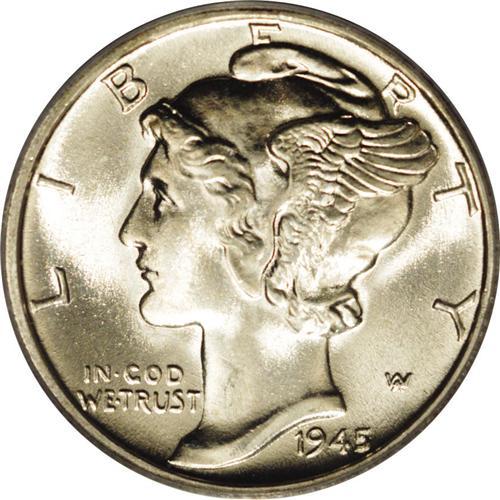 <B>1945 10C MS64 Full Bands PCGS.</B></I> This is one of the key dates for the collector who demands the Full Bands designation. Obviously, the Philadelphia Mint turned down the striking pressure to coin these in 1945, and very, very few are found with enough separation to earn this title. The present coin is bright white and lustrous, with a few scattered abrasions expected for the grade. Population: 40 in 64, 48 finer (1/06).