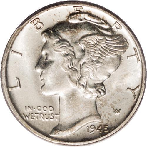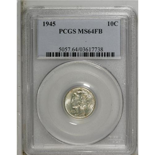 <B>1945 10C MS64 Full Bands PCGS.</B></I> Well struck with a bright, satiny appearance and a slight degree of speckled orange-gold patina on the obverse. Faint die clash marks are noted in the obverse and reverse fields. There are no marks or blemishes on the coin that would seem to preclude an even finer grade assessment.<BR><BR><b>Shipping:</b> Coin/Currency (<a target="_blank" href="http://www.heritageauctions.com/common/shipping.php">view shipping information</a>)