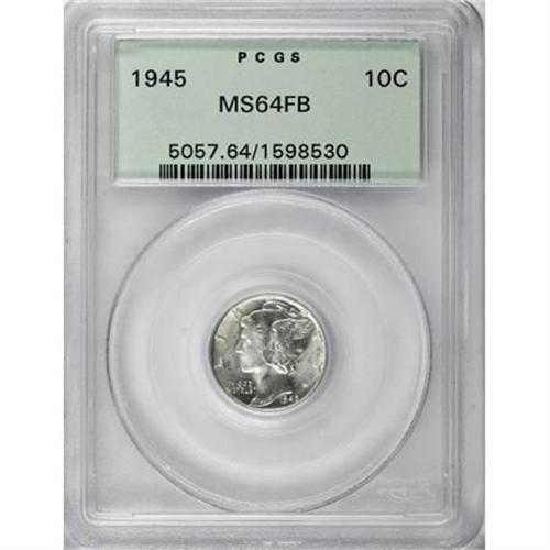 <B>1945 10C MS64 Full Bands PCGS.</B></I> Rare with Full Bands, and therefore subject to engraving, mintmark removal, and other larcenies, the 1945 in Full Bands should always be bought certified. This piece displays boldly rounded bands, with gleaming silver-gold surfaces. Certified in a green-label holder. Population: 42 in 64 Full Bands, 50 finer (3/08).<BR><BR><B>Coin Engraver:</B> Adolph A. Weinman<BR><BR><b>Shipping:</b> Coins & Currency (<a target="_blank" href="http://www.heritageauctions.com/common/shipping.php">view shipping information</a>)