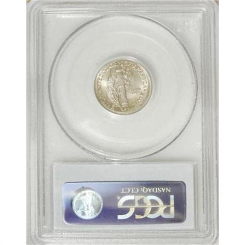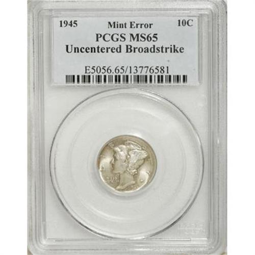 <B>1945 10C Mercury Dime--Uncentered Broadstrike--MS65 PCGS.</B></I> <BR><BR><B>Coin Engraver:</B> Adolph A. Weinman<BR><BR><b>Shipping:</b> Coins & Currency (<a target="_blank" href="http://www.heritageauctions.com/common/shipping.php">view shipping information</a>)