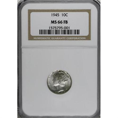 <B>1945 10C MS66 Full Bands NGC.</B></I> Thirty years ago, when Harold Kritzman was on a one-man campaign to educate collectors and dealers about Full Band dimes, it came as quite a surprise to learn that the key to the Full Band series was the 1945-P. After all, with more than 159 million pieces struck how hard could it be? The intervening years have answered the question: it is extremely difficult to locate this issue in any grade with complete definition on the central bands. Of course, such a coin in MS66 is even rarer (and more valuable) with only a handful of pieces known. NGC has only certified six pieces in this grade with one finer (8/07). This is a splendid piece with thick, frosted mint luster. Just the slightest hint of toning is seen on each side with a couple of specks of deeper golden present. Essentially defect-free, the surfaces appear clean enough for an even higher grade. <BR><BR><B>Coin Engraver:</B> Adolph A. Weinman<BR><BR><b>Shipping:</b> Coins & Currency (<a target="_blank" href="http://www.heritageauctions.com/common/shipping.php">view shipping information</a>)