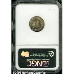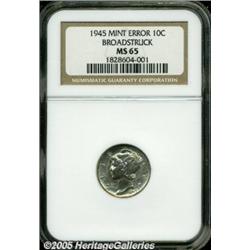 <B>1945 10C Mercury Dime--Broadstruck--MS65 NGC.</B></I> The 1945 Dime is notorious for its near impossibility to locate with fully split bands. Perhaps the easiest way to obtain such a prize is to seek broadstruck examples, which have a better strike in the centers since no collar was present to prevent the dies from approaching. Alas, the bands are not quite fully split on the present piece, which has a semi-prooflike appearance and medium tan-gray color. The broadstrike is slightly uncentered, the unstruck portion widest at 3 o'clock.