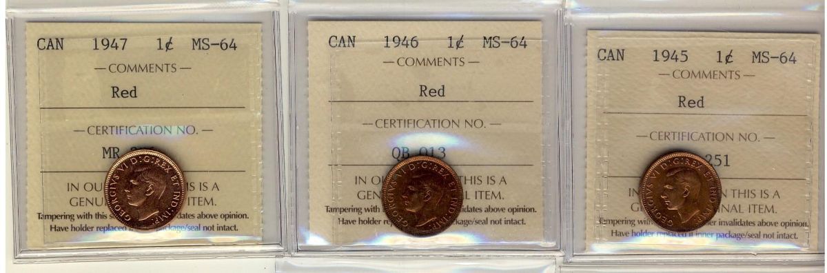 1945, 1946 & 1947 1¢ ICCS MS64RD. Lot of three coins.