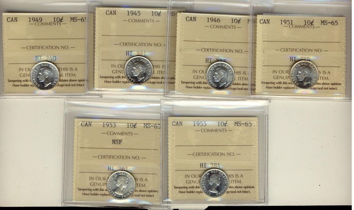 1945, 1946, 1949, 1951, 1953 NSF & 1955 10¢ ICCS MS65. Lot of 6 coins all blast white.