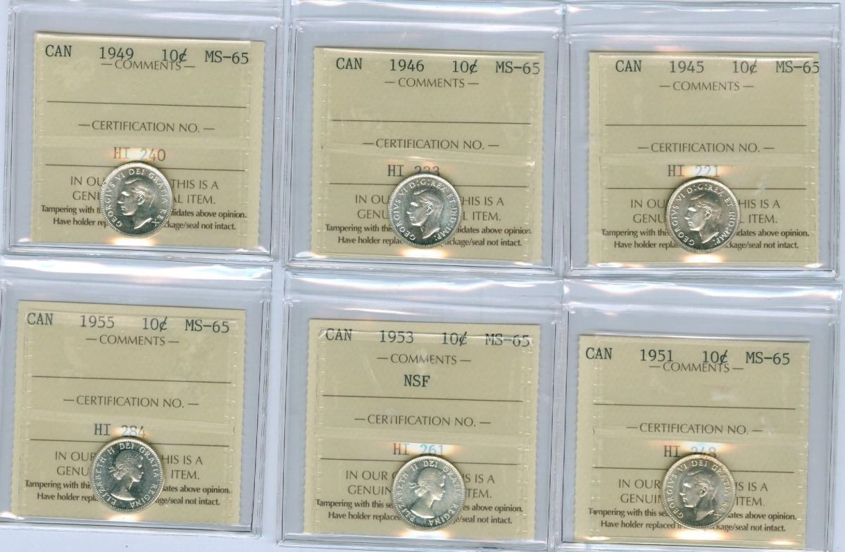 1945, 1946, 1949, 1951, 1953 NSF & 1955 10¢ ICCS MS65. Lot of 6 coins all blast white.