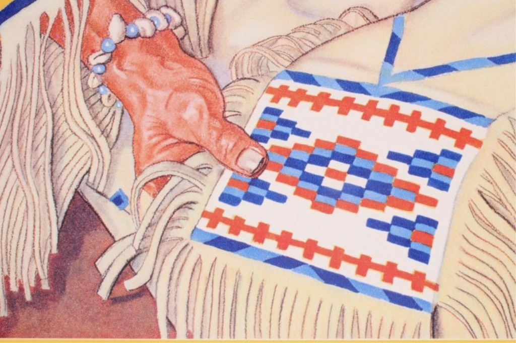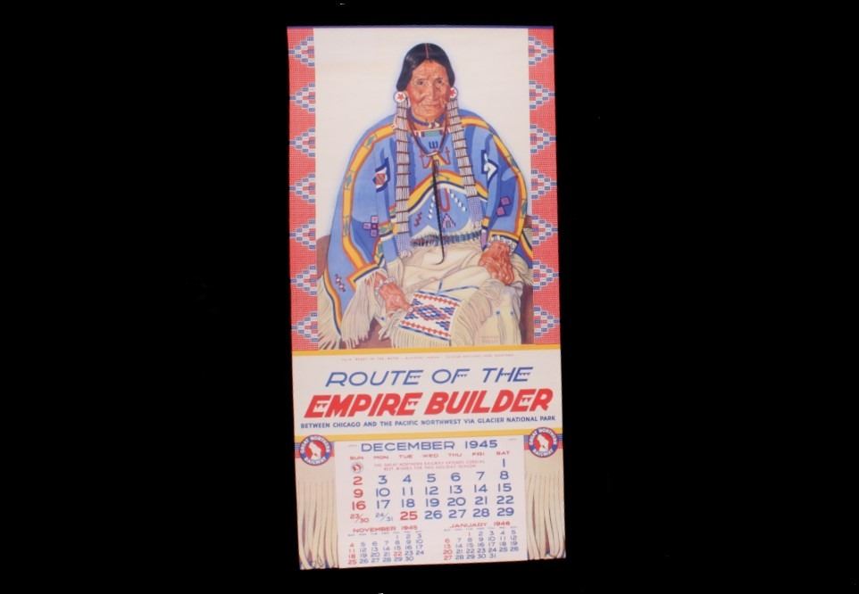 Featured in this lot is this 1945-46 calendar from the Great Northern Railway. The calendar features the artwork of Winold Reiss, who is well known for his artwork of the Blackfeet Indians. This poster shows artwork depicting a Blackfeet Indian woman and is titled "Julia-Wades-In-The Water" from Glacier National park, Montana. The condition of this poster/ calendar is good, with no obvious signs of damage. The measurements of this calendar are 32 3/4" x 16".