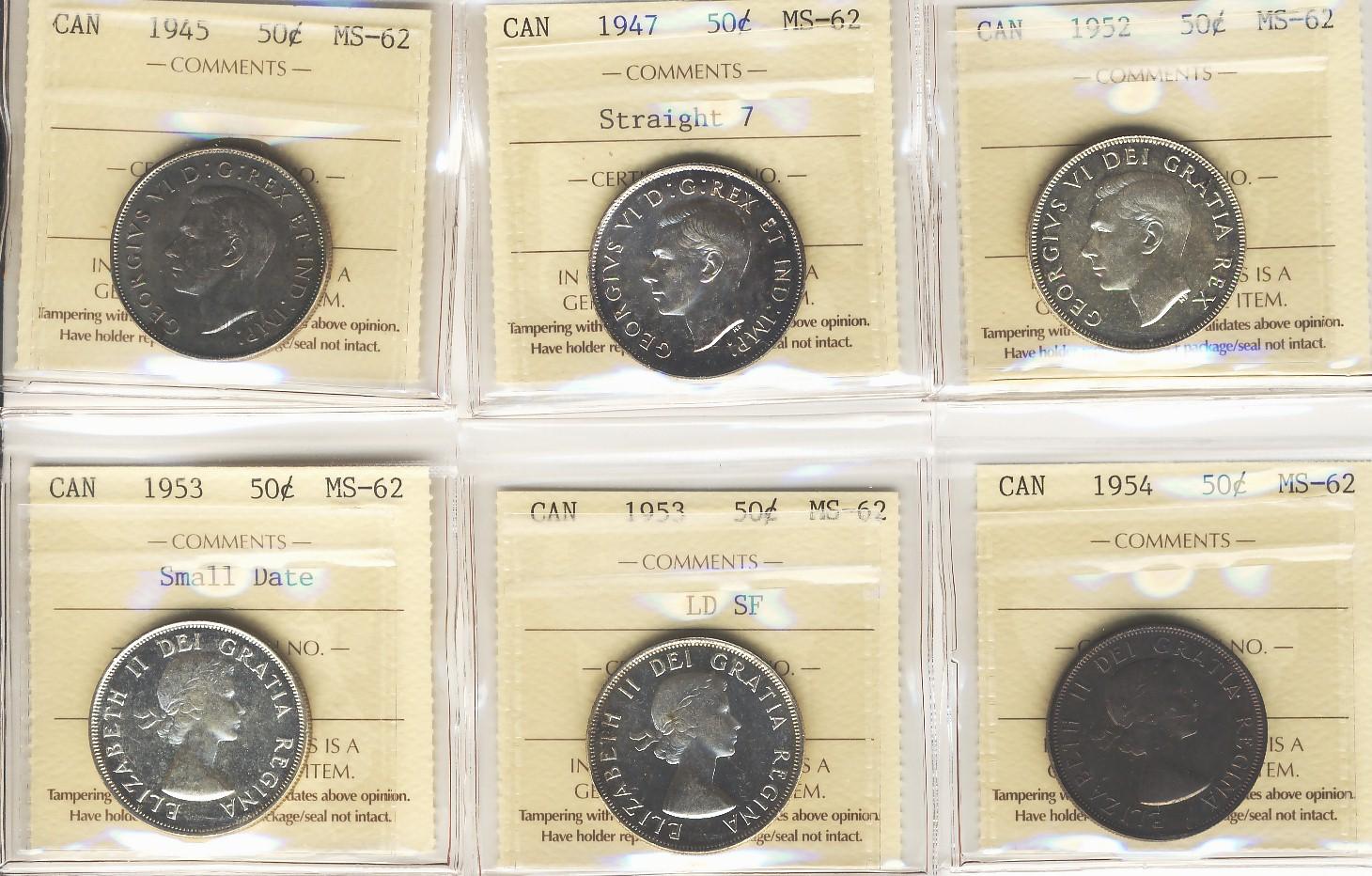 1945, 1947 ST 7, 1952, 1953 SD, 1953 LD SF, 1954, 50¢ all ICCS MS62, Lot of 6 coins,