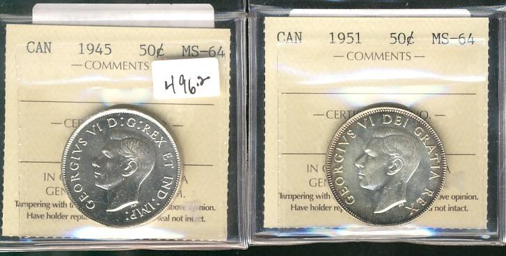 1945 & 1951 50¢ ICCS MS64. Lot of 2 coins.