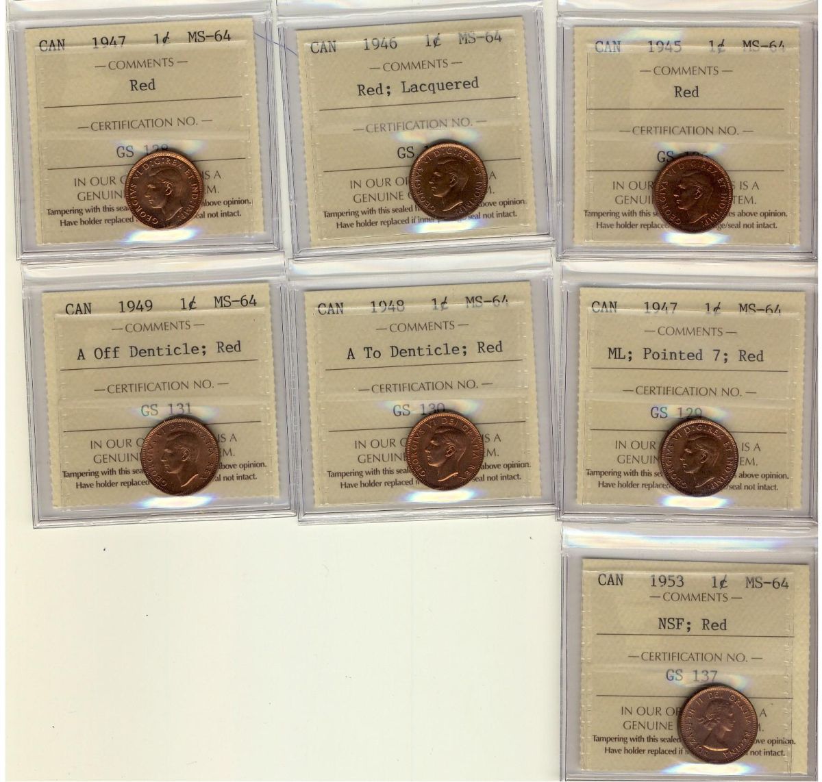 1945 - 1953 1¢. Lot of seven ICCS MS64RD coins including, 1945, 1946 Lacquered, 1947, 1947 ML Ptd 7, 1948 A To, 1949 A Off and 1953 NSF.
