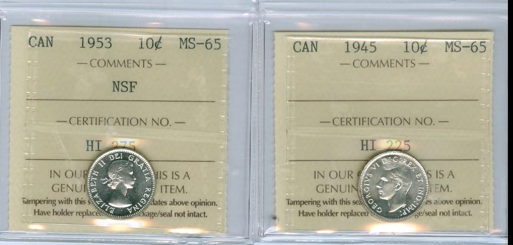 1945 & 1953 NSF 10¢ ICCS MS65. Lot of 2 coins both full whi