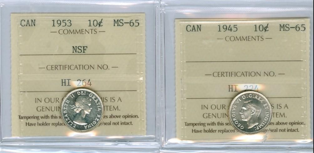 1945 & 1953 NSF 10¢ ICCS MS65. Lot of 2 coins both full white and lustrous.