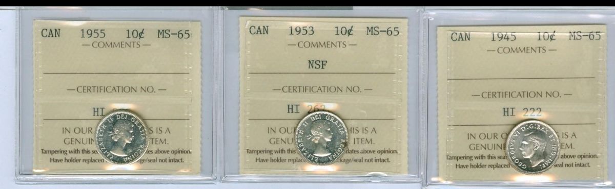 1945, 1953 NSF & 1955 10¢ ICCS MS65. Lot of 3 coins all full white and lustrous.