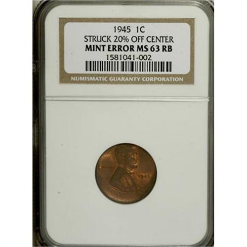 <B>1945 1C Lincoln Cent--Struck 20% Off Center--MS63 Red & Brown NGC.</B></I> <BR><BR><B>Coin Engraver:</B> Victor D. Brenner<BR><BR><b>Shipping:</b> Coins & Currency (<a target="_blank" href="http://www.heritageauctions.com/common/shipping.php">view shipping information</a>)