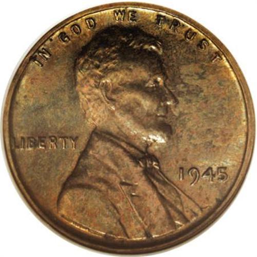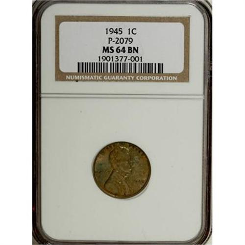 <B>1945 1C Lincoln Cent, Pollock-2079, MS64 Brown NGC.</B></I> Struck from regular issue dies in bronze alloy with a plain edge, but on a thick planchet. 1944 cents are also known on thick stock (Pollock-2078). Pollock lists two known examples, lots 2581 and 2582 from a 9/89 Bowers and Merena auction. These weighed 63.9 and 63.7 grains, instead of the expected 48 grains. The present well struck piece has honey-gold and aqua toning. The obverse rim appears defective at 10 o'clock, as made.<BR><BR><b>Shipping:</b> Coins & Currency (<a target="_blank" href="http://www.heritageauctions.com/common/shipping.php">view shipping information</a>)