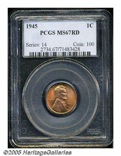 <B>1945<1C> MS67 Red PCGS.</B></I> As fresh as the day it was made. A beautiful, completely struck example with blazing red mint luster and no spotting. Faint die clash marks (as struck) reside in the reverse fields, but there are no post-striking defects to be found, on either side of the piece. Population: 39 in 67 Red, 0 finer (6/05).<BR><I>From The William Bickel Collection, Part One.</B></I>