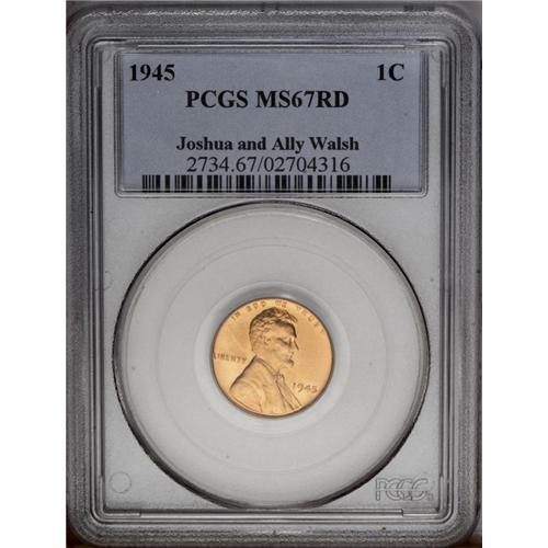 <B>1945<1C> MS67 Red PCGS.</B></I> Ex: Joshua and Ally Walsh. A beautiful honey-gold Superb Gem, highly lustrous and nearly devoid of contact. A small area of prooflike surface is seen near 1 o'clock on the reverse. The strike is above average, but not quite full. Surprisingly scarce at the MS67 Red level. Population: 42 in 67, 0 finer (4/06).