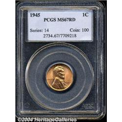 <B>1945<1C> MS67 Red PCGS.</B></I> A beautiful, well struck example with blazing mint luster and no spotting. As fresh as the day it was made.<BR><I>From The Kyle Patrick collection of Lincoln Cents.</B></I> <BR><BR><B>Important notice:</B> Heritage usually auctions material at the rate of 200-250 lots per hour. On some occasions eBay Live bid software or the Internet may not be able to keep up with the pace of the auction. We recommend placing a realistic absentee bid now as insurance to avoid disappointment. Occasionally the auctioneer may eliminate or reject an eBay Live bid, and the auctioneer may also reopen a lot after the close of the eBay live bidding (usually because we missed an audience bid), and may reject your bid even if it shows you as the winning bidder. By bidding via eBay Live, you agree that Heritage may award the lot to another bidder at its sole discretion under the circumstances described above or any other reasonable circumstances. Since eBay bids are not shown to us until we open the lot on the floor, we treat those bids just like floor bids. In most cases the floor responds before the eBay bid is presented to us, due to Internet lag time, so for consistency we have made it a policy that floor bids are always considered first over tie eBay live bids. Also please note that all Heritage lots purchased through eBay Live carry a 20% Buyer's Premium. Please make sure you read the Terms and Conditions before you bid.
