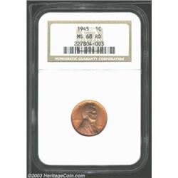 1945 1C MS68 Red NGC. Virtually flawless surfaces that are beautifully patinated with varying shades of sunset-red and orange color. The single finest '45 Lincoln certified by either major grading service, insuring its appeal among Registry Set collectors. Population: 1 in 68, 0 finer (2/03). Important notice: We expect to be auctioning lots at the rate of 200-250 per hour. On occasion eBay live bid software cannot keep up with the pace of the auctions where 4-5 lots per minute can hammer down, so we recommend that you place a realistic absentee bid now as insurance to avoid disappointment. Also please note that all Heritage/CAA lots purchased through eBay Live carry a 20% Buyer's Premium. Please make sure you read the Terms and Conditions.