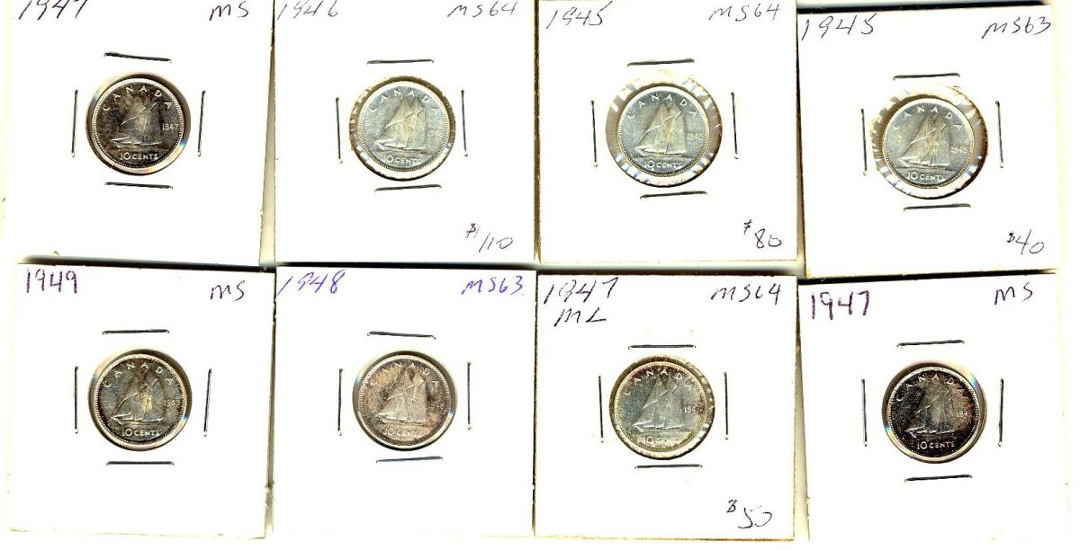 1945 (2), 1946, 1947 (2), 1947 ML, 1948, 1949 10¢, lot of 8 coins. All MS62 or better.