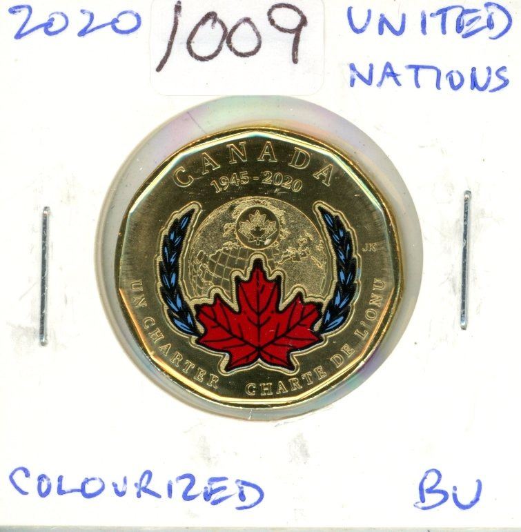 1945 – 2002 United Nations Colourized Looonie. From an original Mint roll. BU.