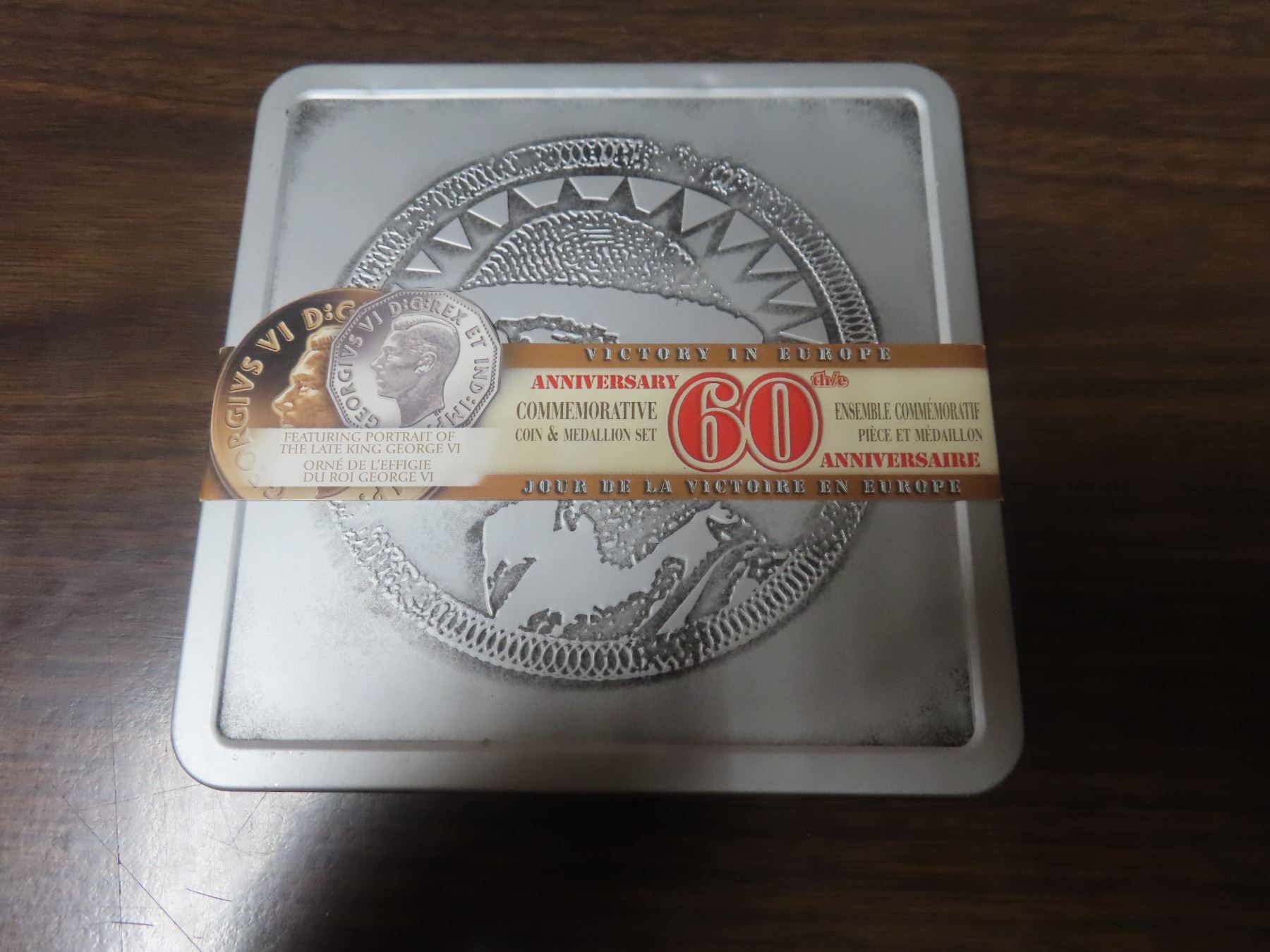1945 – 2005 60th Anniversary of Victory in Europe Set. Proof Sterling Silver 5 Cents plus large bronze medal. Housed in its original Royal Canadian Mint packaging.