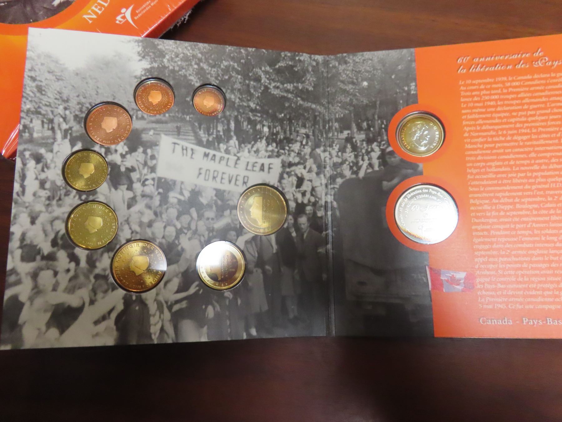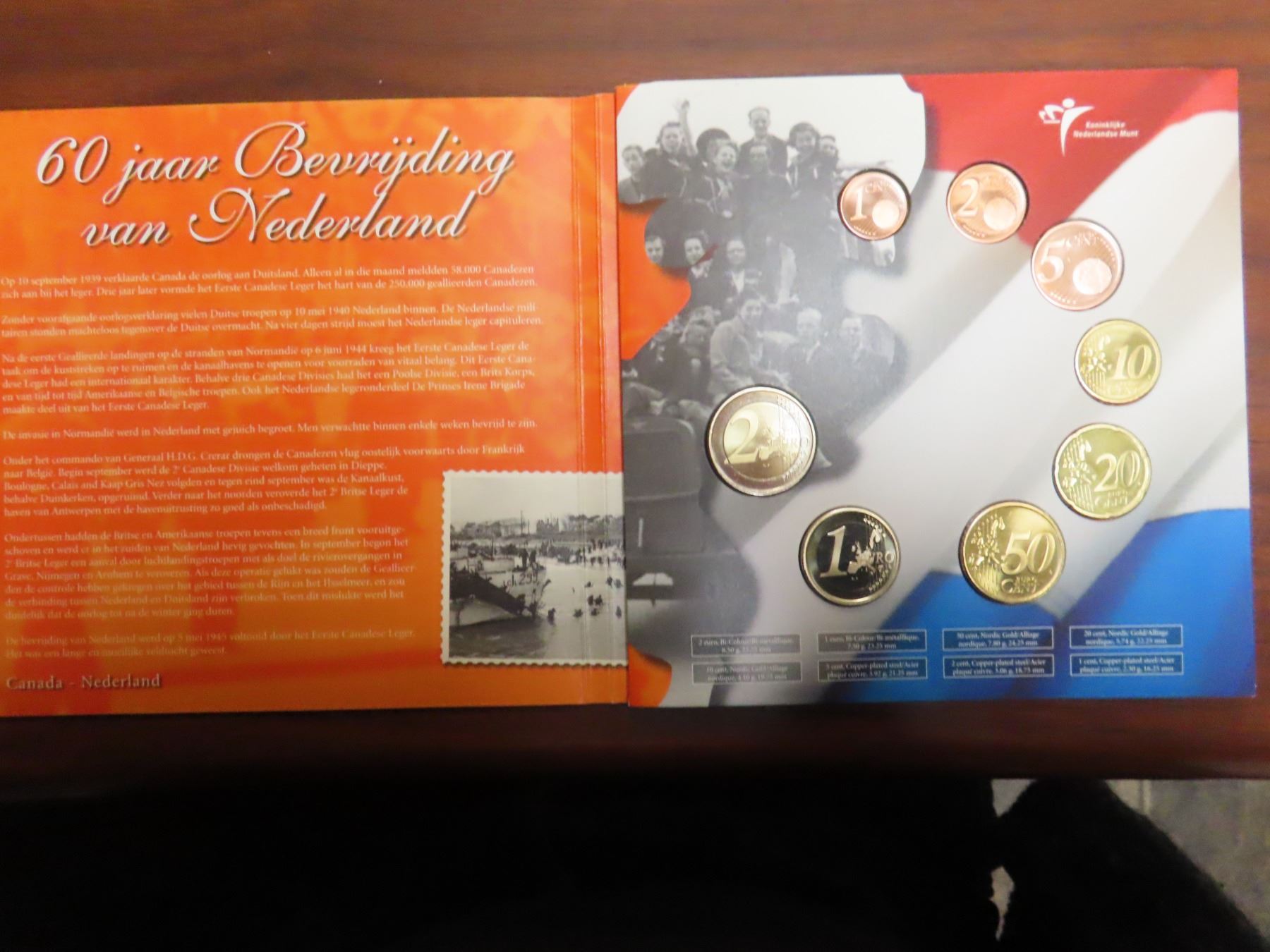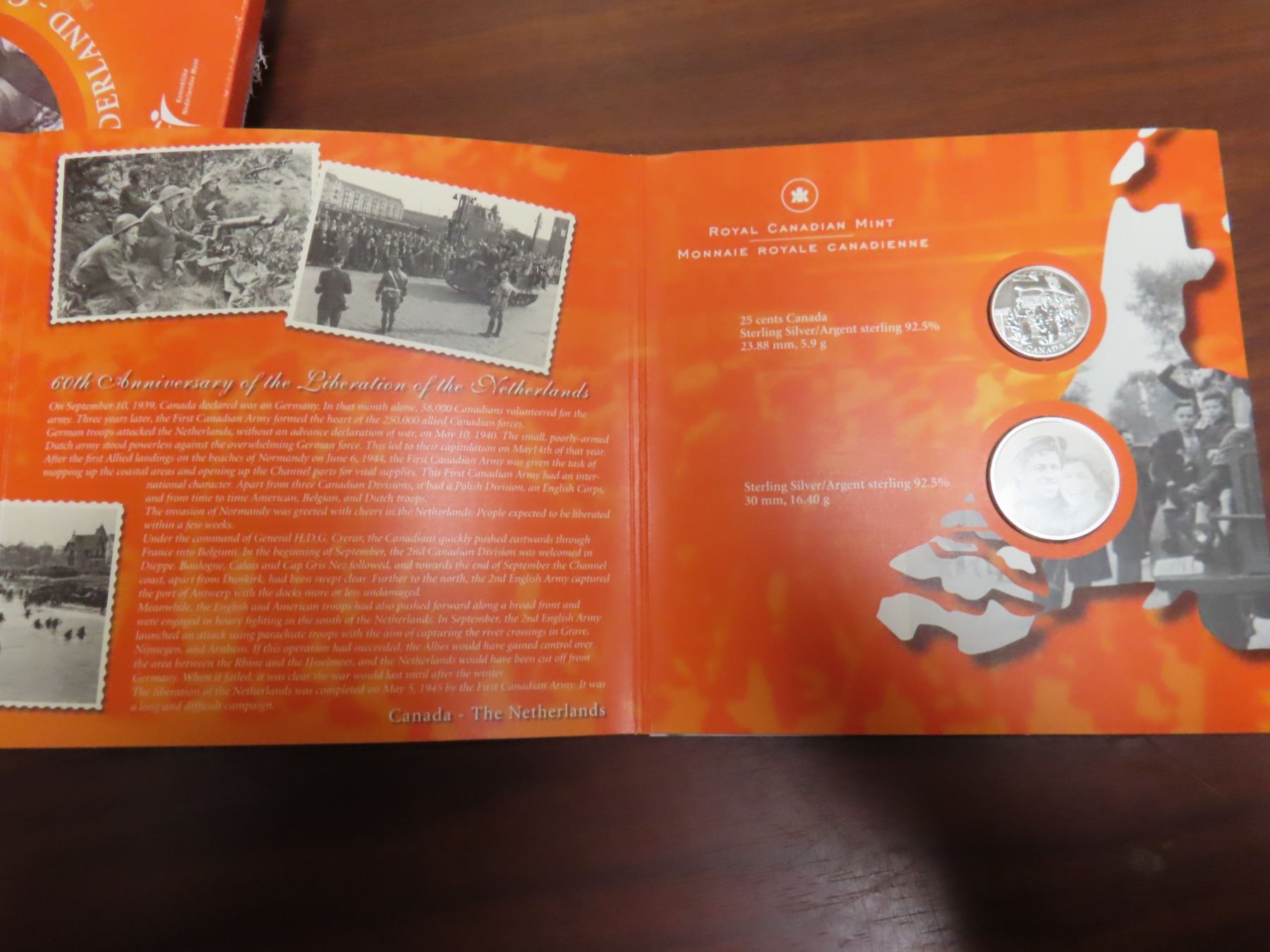 1945 – 2005 60th Anniversary of the Liberation of the Netherlands by Canadian troops. This special set includes a special Canadian Sterling Silver 25 Cents only available in this set, a Sterling Silver medal, plus a complete set of 8 Netherlands Euro set. Housed in its original Royal Canadian Mint folder & box of issue. Includes Certificate of Authenticity.