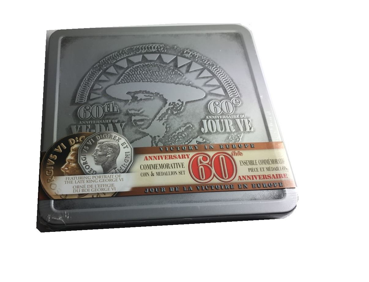 Packaging: 2005 (1945-) Canadian 5-Cent Victory in Europe/VE Day 60th Anniv Proof Silver Coin & Medallion Gift Set includes graphic tin and 36-pg illustrated booklet.
