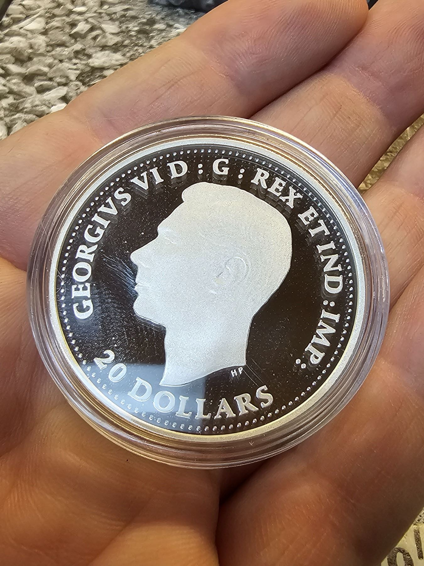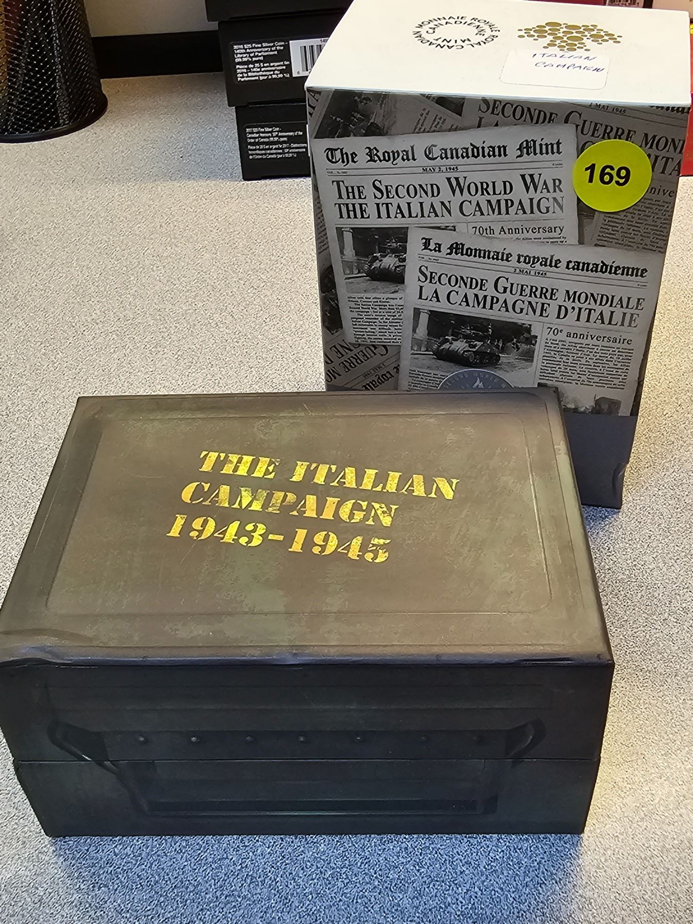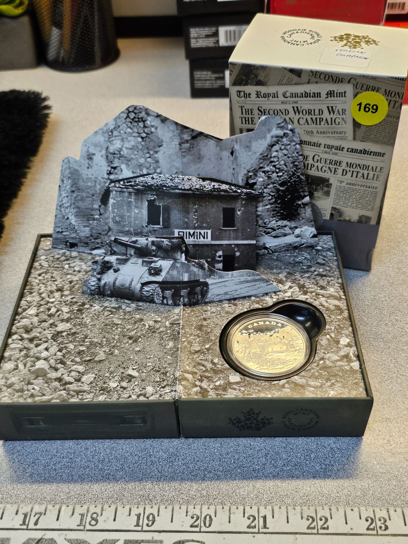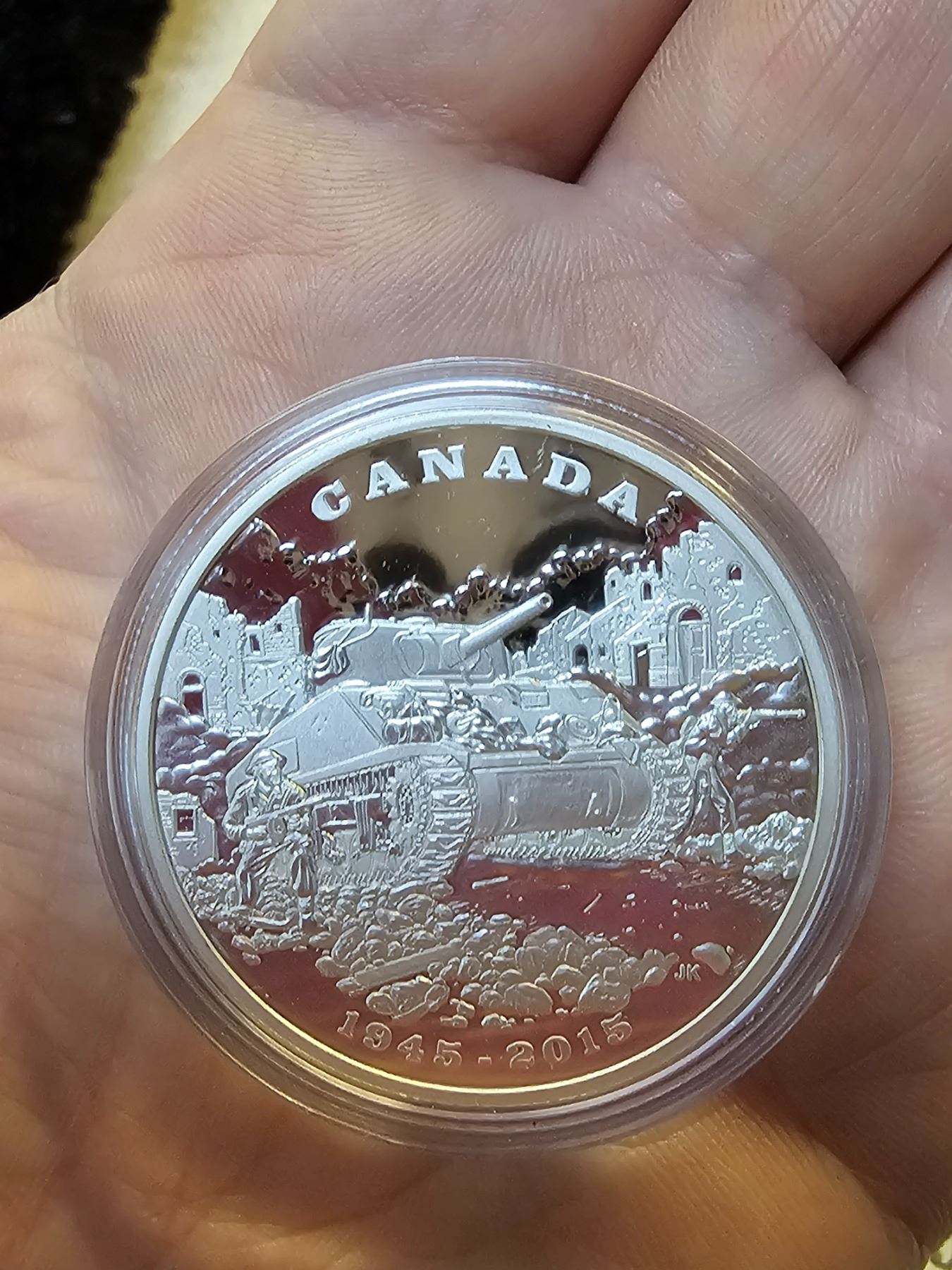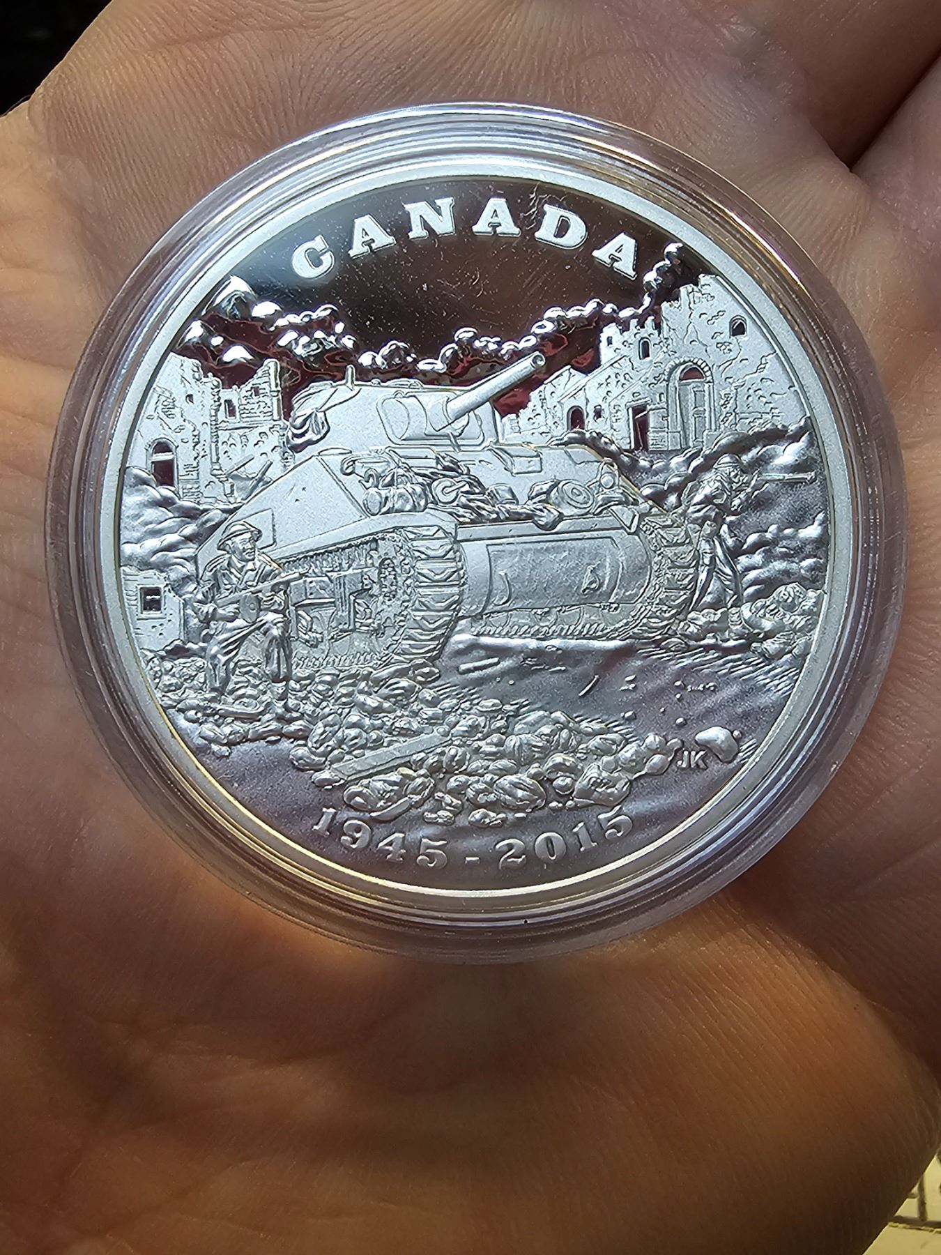 1945 – 2015 $20 The Second World War: The Italian Campaign. Depicts a Canadian Sherman Tank plus 2 Canadian soldiers. Obverse depicts King George VI. Proof with Ultra Heavy Cameo. 99.99% pure Silver. Housed in its original Royal Canadian Mint case & box of issue, along with a Certificate of Authenticity.