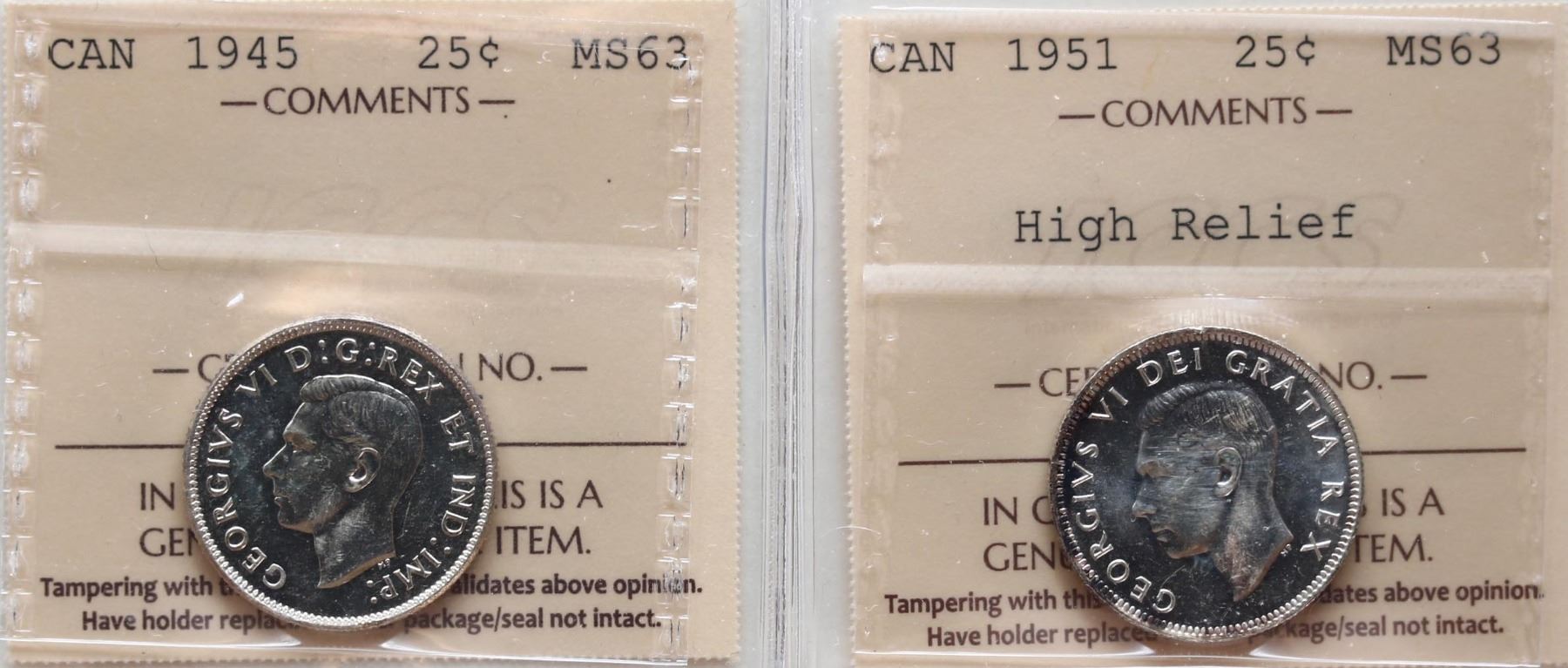 1945 25¢, 1951 "HR" Both coins ICCS Choice Mint State-63.