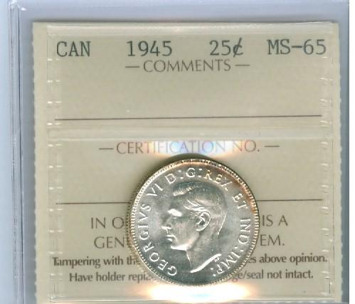 1945 25¢ ICCS MS65. Blast white and quite attractive.