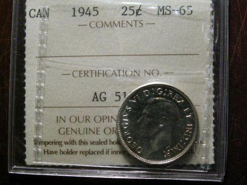 1945 25¢ ICCS MS65. Hint of golden toning with full lustre. A real "GEM".