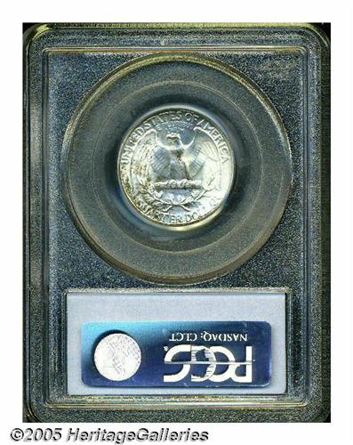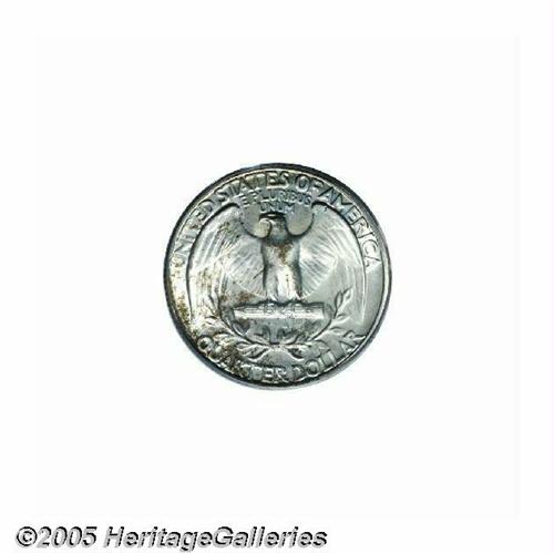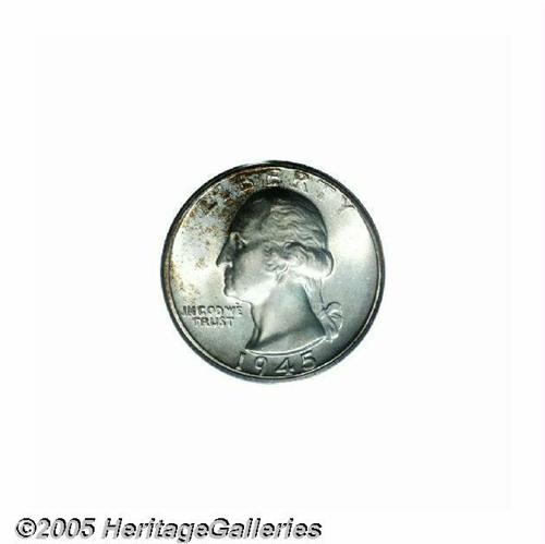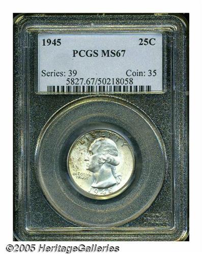 <B>1945<25C> MS67 PCGS.</B></I> An overlooked issue with a substantial mintage of more than 74 million pieces. The 1945 is underrepresented in the Superb category, especially in PCGS holders, with only 10 pieces so graded and one finer (5/05). This is a mostly brilliant example that shows a smattering of golden-brown patina on the left portion of each side. The soft, frosted mint luster is unaffected by any noticeable abrasions.