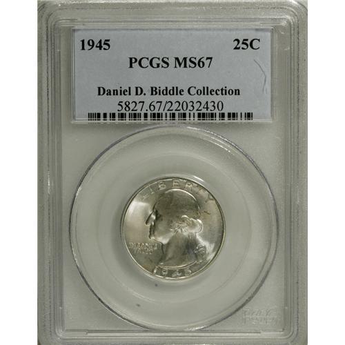 <B>1945 25C MS67 PCGS.</B></I> Ex: Daniel D. Biddle Collection. Sharply struck and fully lustrous with delightful obverse powder-blue and apricot toning. The reverse is essentially brilliant. A few letters near the rims have soft centers, but the strike is otherwise exacting. Population: 14 in 67, 1 finer (1/07).<BR><BR><b>Shipping:</b> Coins & Currency (<a target="_blank" href="http://www.heritageauctions.com/common/shipping.php">view shipping information</a>)