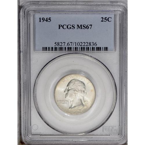 <B>1945<25C> MS67 PCGS.</B></I> The obverse of this impeccably preserved Wartime issue is framed in delicate orange toning while the reverse is mostly brilliant. Both sides possess abundant luster. Population: 12 in 67, 1 finer (4/06).