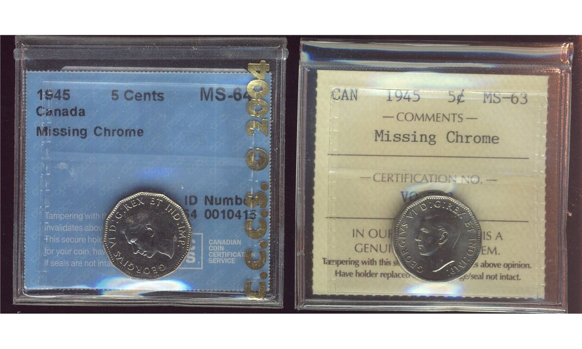 1945 5¢ Missing Chrome ICCS MS63 & CCCS MS64. Lot of 2 coins.