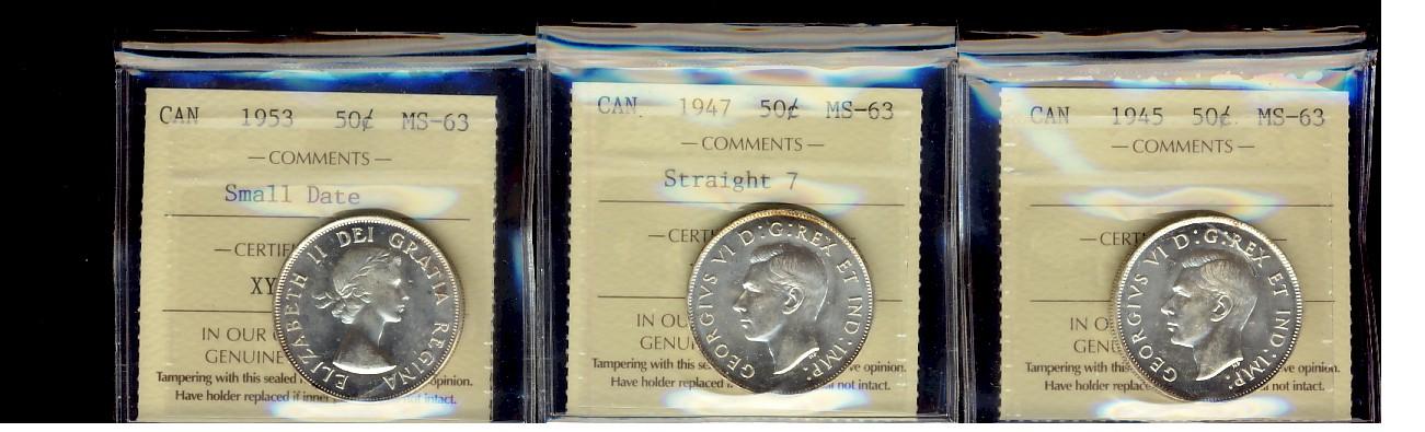 1945 50¢, 1947 St7 & 1953 SD ICCS MS63. Lot of 3 coins.