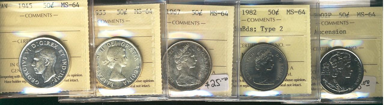 1945 50¢, 1955, 1967, 31982 SmBds T2 & 2002P Ascension ICCS MS64. Lot of 5 coins.