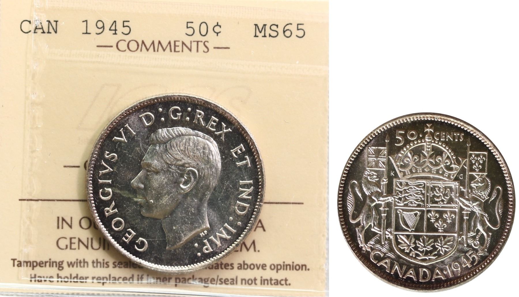 1945 50¢ ICCS Gem Mint State-65 Brilliant and lustrous with hint of russet tone around the rims. Very scarce date and extremely difficult to find in top condition. Truly underrated.