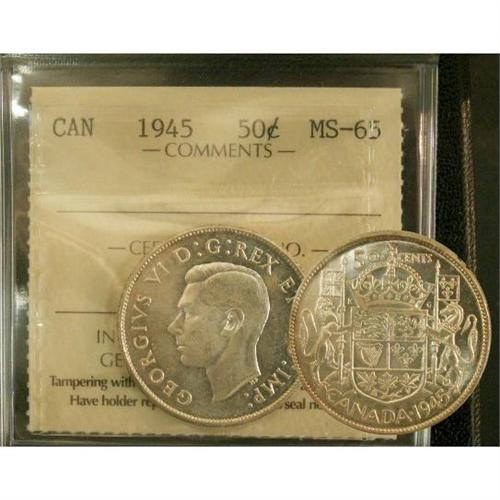 1945 50¢ ICCS MS-65 Light tone. Excellent strike with clean fields and lovely surfaces. Rare in this condition