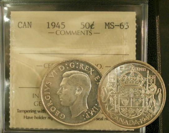 1945 50¢ ICCS MS65 Light tone. Excellent strike with clean fields and lovely surfaces. Rare in this condition