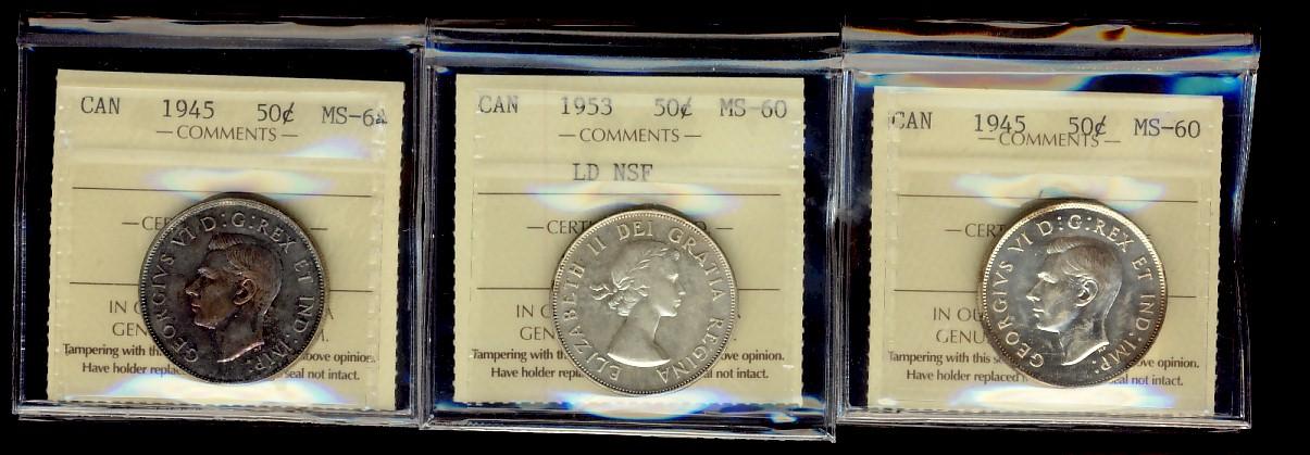 1945 50¢ MS60 & MS64 along with 1953 LD NSF MS60. Lot of 3 coins.