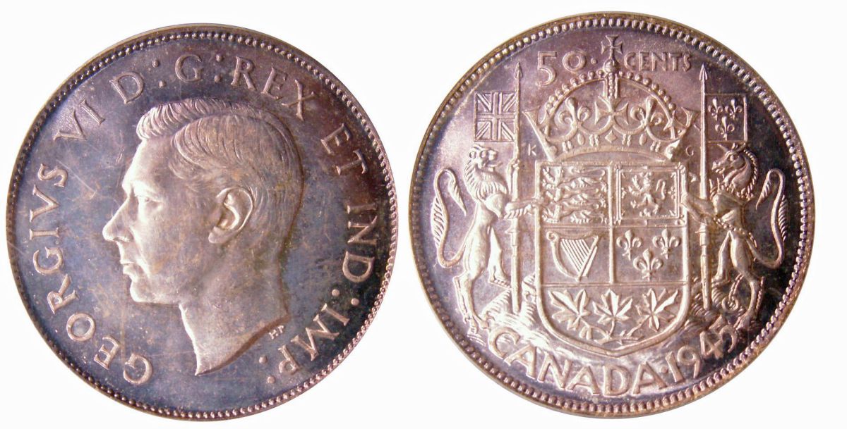 1945 50¢ Norweb PCGS MS65. Light purple rim tone. Excellent strike with clean fields and nice surfaces.
