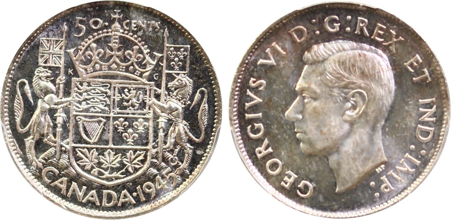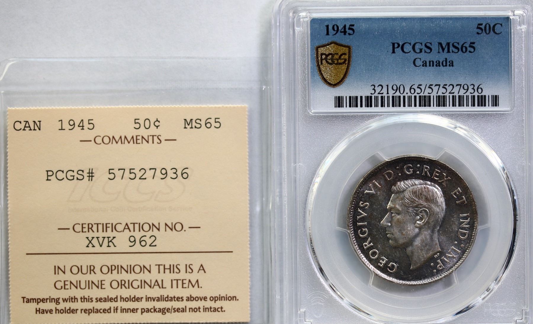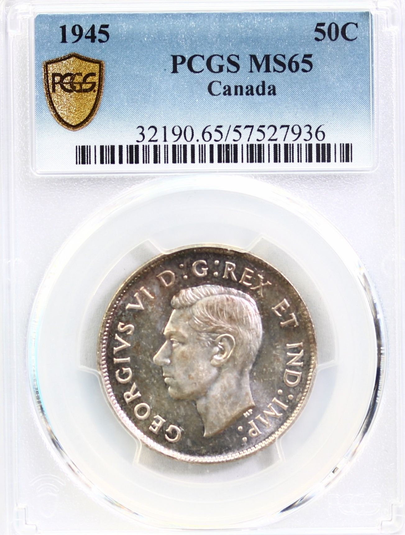 1945 50¢ PCGS Gem Mint State-65, ICCS crossgraded Mint State-65, in PCGS slab. Top 3 at PCGS, an impressive registry opportunity. A marvelous example with the lightest bit of golden blue toning gracing the fully lustrous and semi-prooflike fields and cameo portrait of King George. PCGS lists a mere three coins certified this high with none finer, neither of the two remaining PCGS Gem Mint State-65 examples are available on the market making this piece effectively the ONLY opportunity for anybody building a finest known collection or registry set. An absolutely gorgeous piece worthy of the finest collections, don't miss out on this important opportunity.